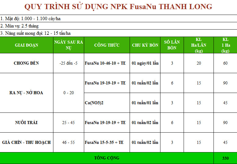 Quy trình phân bón hòa tan FusaNu cho Thanh Long